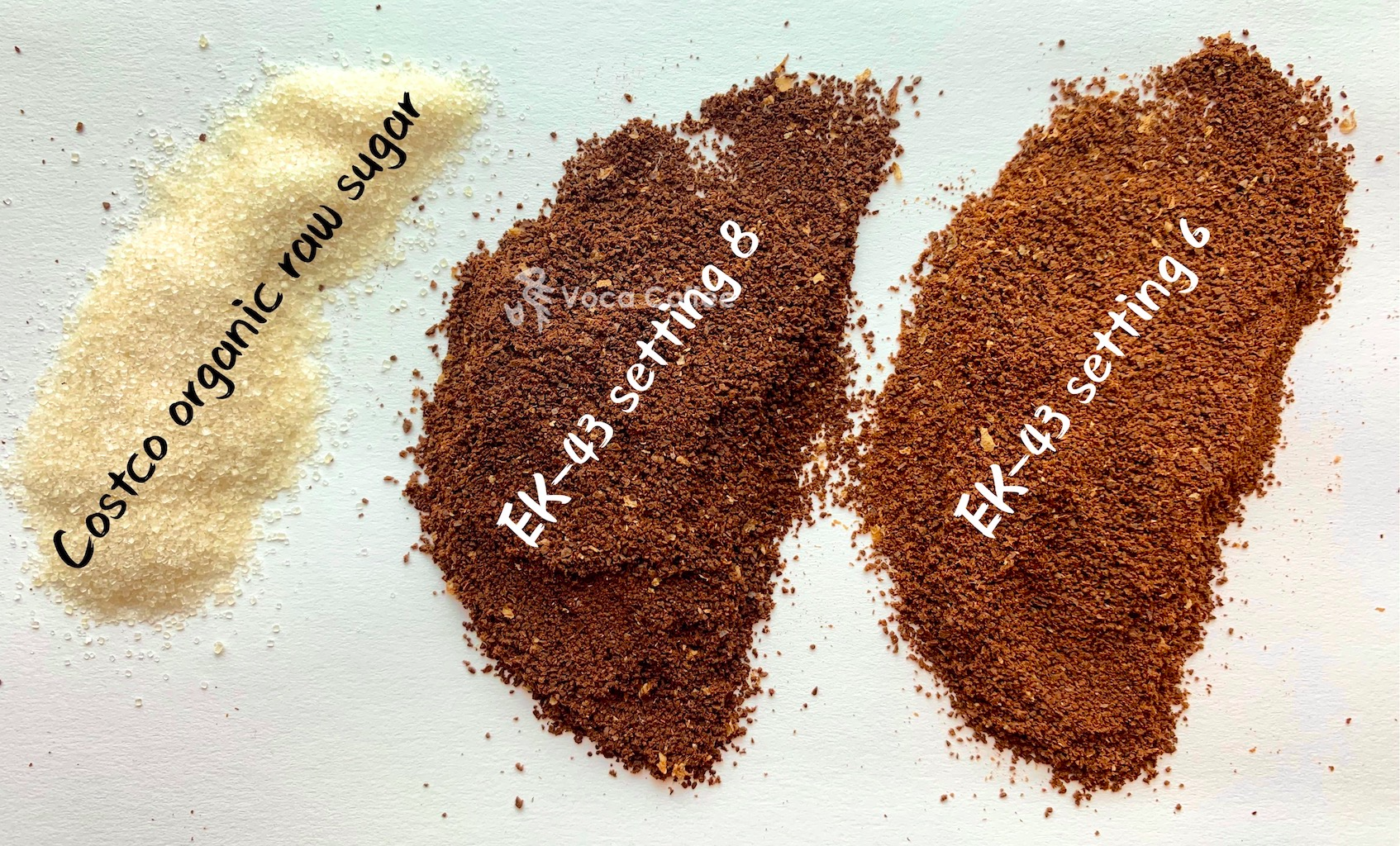 EK-43磨豆机设置8的颗粒大小大概和Costco的有机砂糖差不多,基本0.5毫米以下;EK-43 设置6则更细一些。一般来说,一些中度和中深烘焙的咖啡,用7~8之间;浅烘和中浅烘焙的用6~7之间。