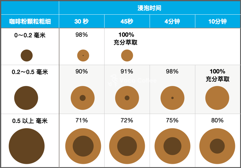 根据业界人士研究,用浸润式冲泡的话,咖啡粉颗粒直径在0.2毫米以下,45秒之内即可达到100%充分萃取;直径在0.2毫米~0.5毫米,在45秒达到91%萃取,4分钟达到98%萃取,而10分钟方可达到100%萃取;直径在0.5毫米以上,则基本无法达到充分萃取,颗粒中间总有一部分咖啡无法被萃取,10分钟也只萃取到80% - 换句话说,至少20%的咖啡被浪费掉了。