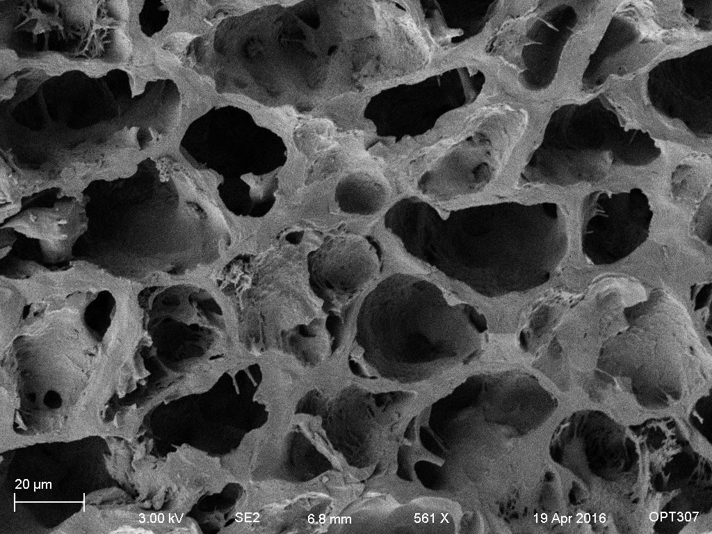 请看下图是烘焙过的咖啡豆在显微镜下的放大几百倍的截面图:咖啡豆里面是网状纤维结构,纤维结构之间孔洞无数。咖啡豆在烘焙过程中,有机物高温后分解,产生二氧化碳,有些在烘焙过程中就释放出去了,但是还有不少被困在咖啡豆的这些千千万万的小孔里。在冲泡过程中,咖啡吸水,网状纤维出现裂缝,被困其中的二氧化碳才得以逃脱。