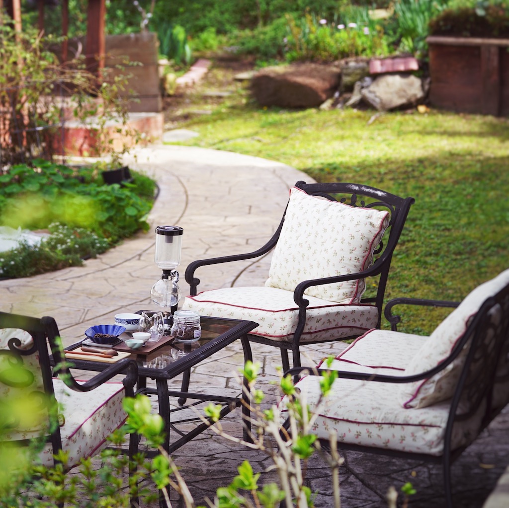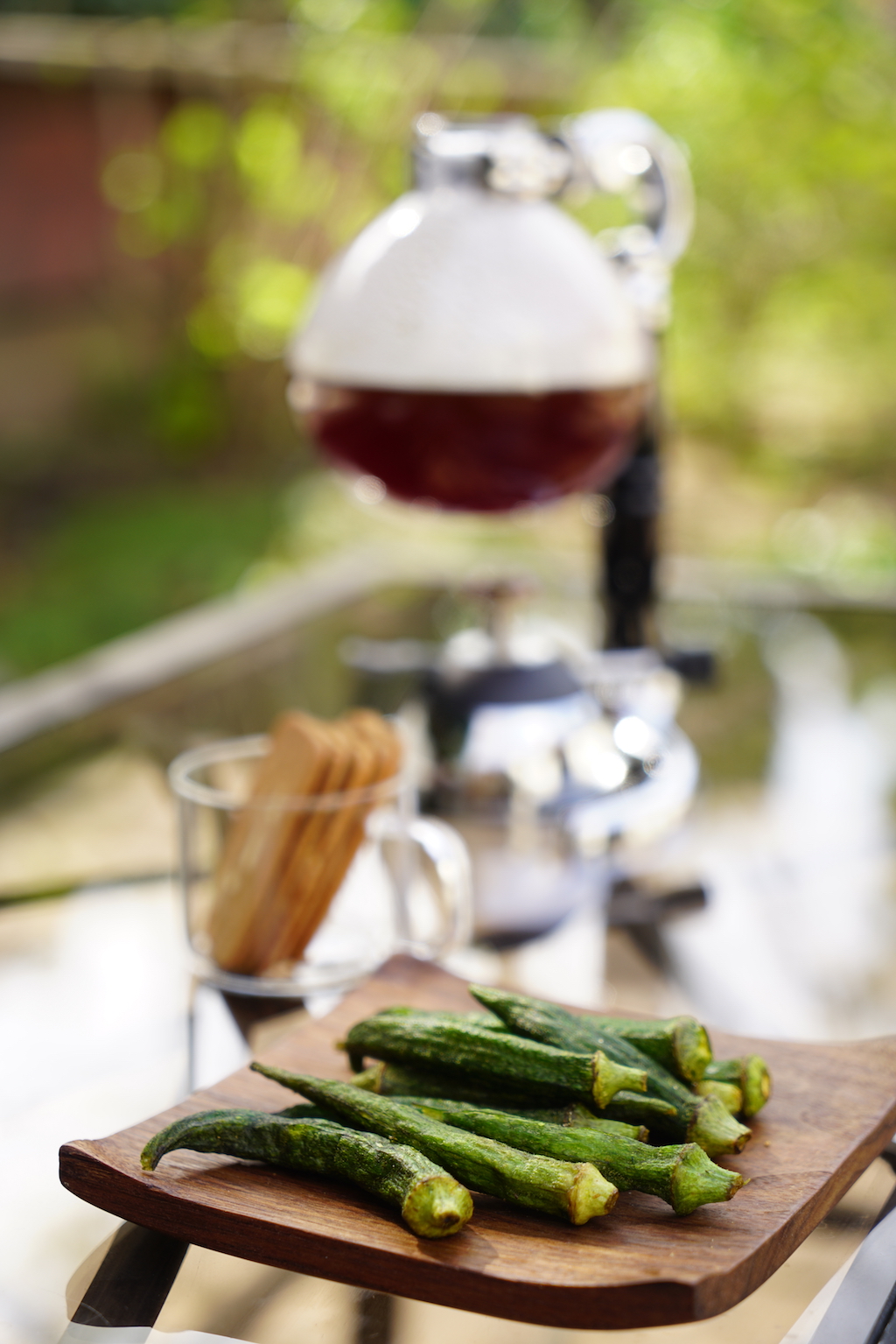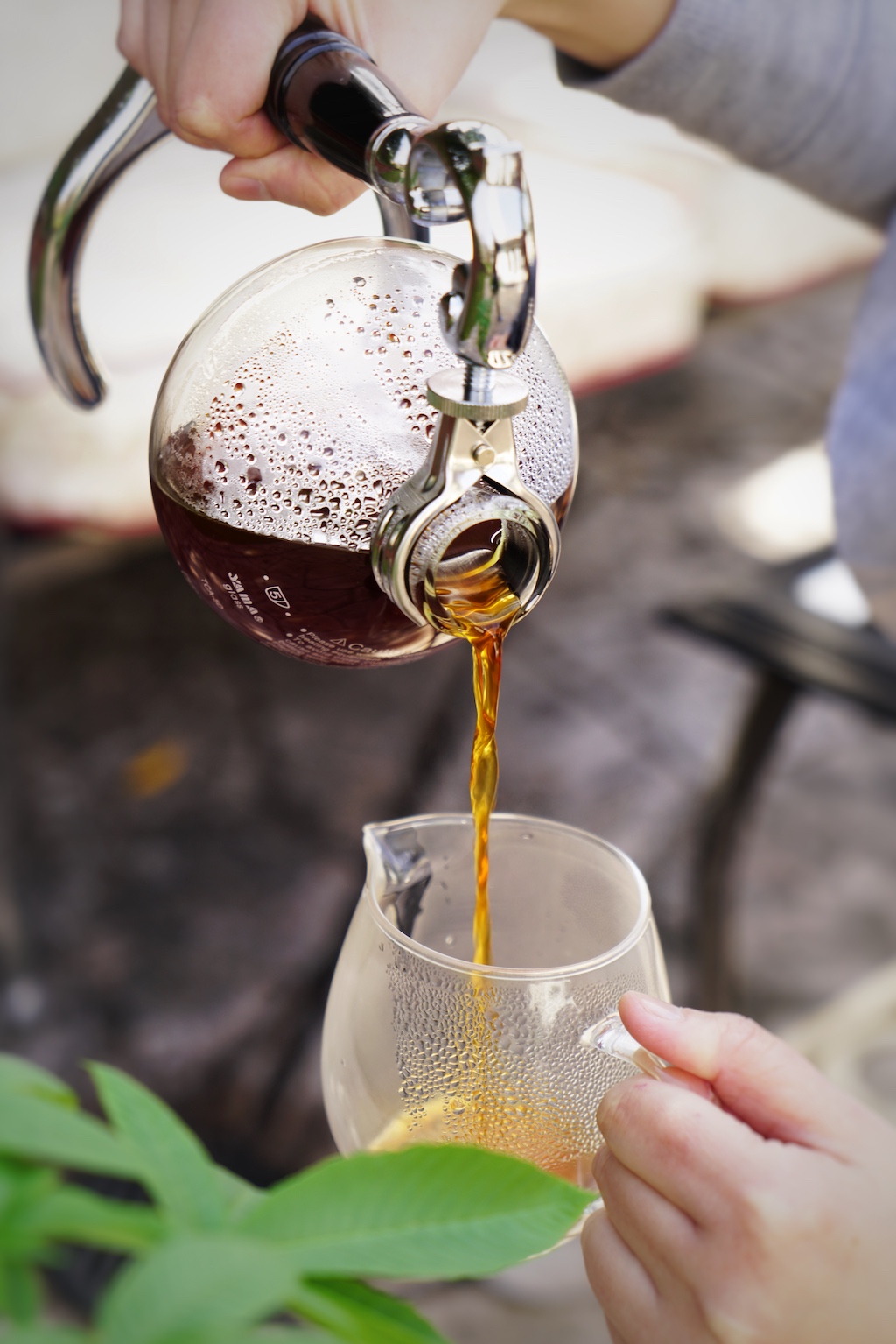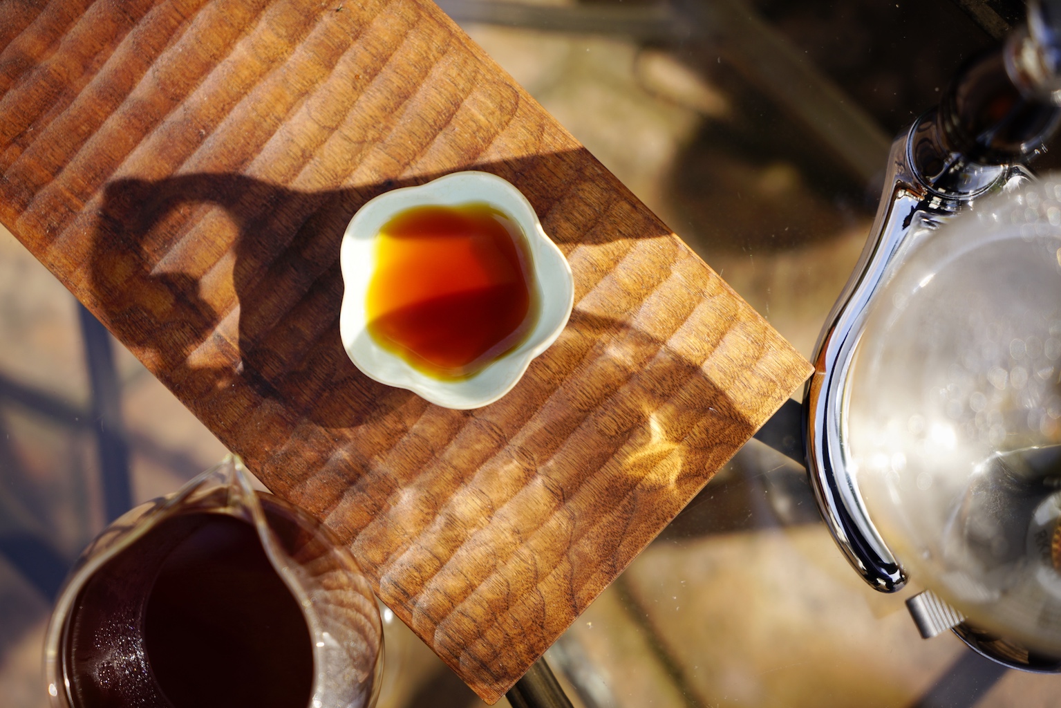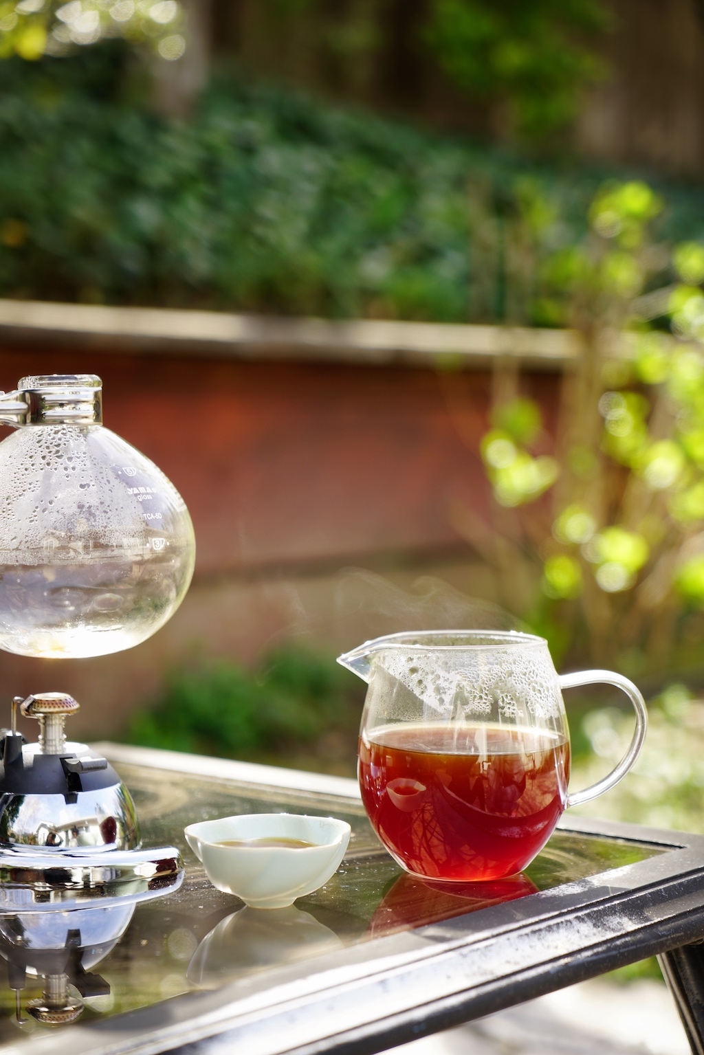 We were trying to capture of the lustrous red color of the coffee under the sun light. Steam came off the carafe, gently dancing in the Spring breeze. We found it soothing and peaceful.