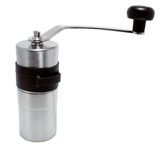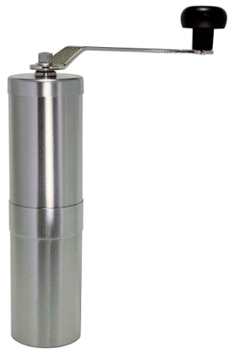 Porlex 不锈钢手动磨豆器。大约$60,日本原装。适合1~2人咖啡用量。体积也很小,携带方便。我用的就是这款,五年来每次出门必带。磨豆的均匀度比我的Mazzer 磨豆器都要好。就是表面太光滑,磨起来很费劲,我就权当锻炼了。