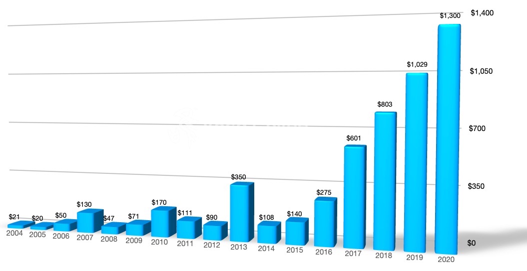 然而,“天价”被不断刷新。接下来的这些年,“最佳巴拿马”咖啡竞拍的价格越拍越高。2007年,超过每磅百元;2019年,涨过一千元。来来来,请看下图,2004年到2020年的“最佳巴拿马”冠军豆最高咖啡竞拍成交价走势图。