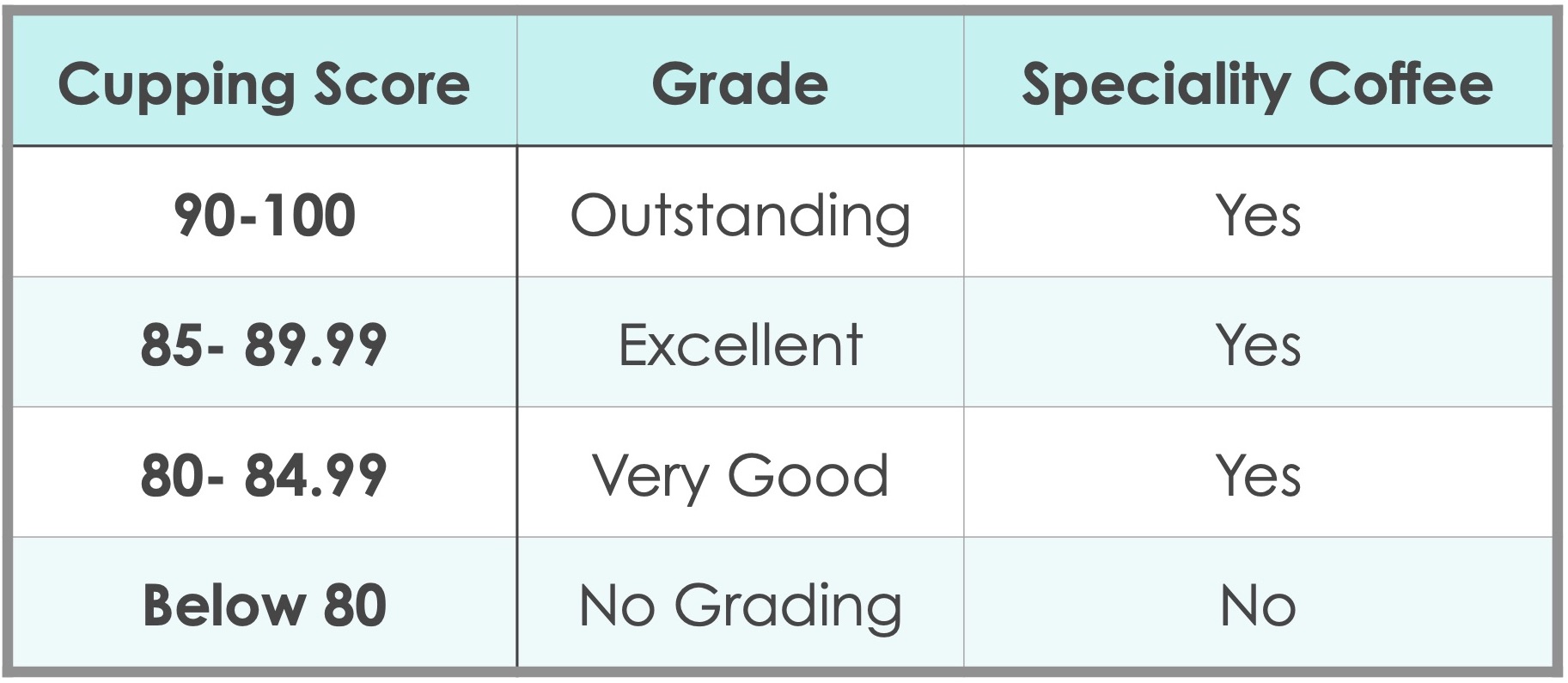 Cupping is a set of standardized procedures providing a consistent methodology for evaluating a coffee's quality. The mostly followed standard cupping procedures are defined by SCAA. The specially certified coffee grader, named Q grader, evaluates various aspects of roasted coffee, including, fragrance, aroma, flavor, acidity, sweetness, body, cleanness, complexity, aftertaste and faults, give grading scores to each evaluating aspect and then calculate the overall cupping score. The cupping scores can be from 0~100. Anything below 80 won’t be considered as Specialty Coffee.