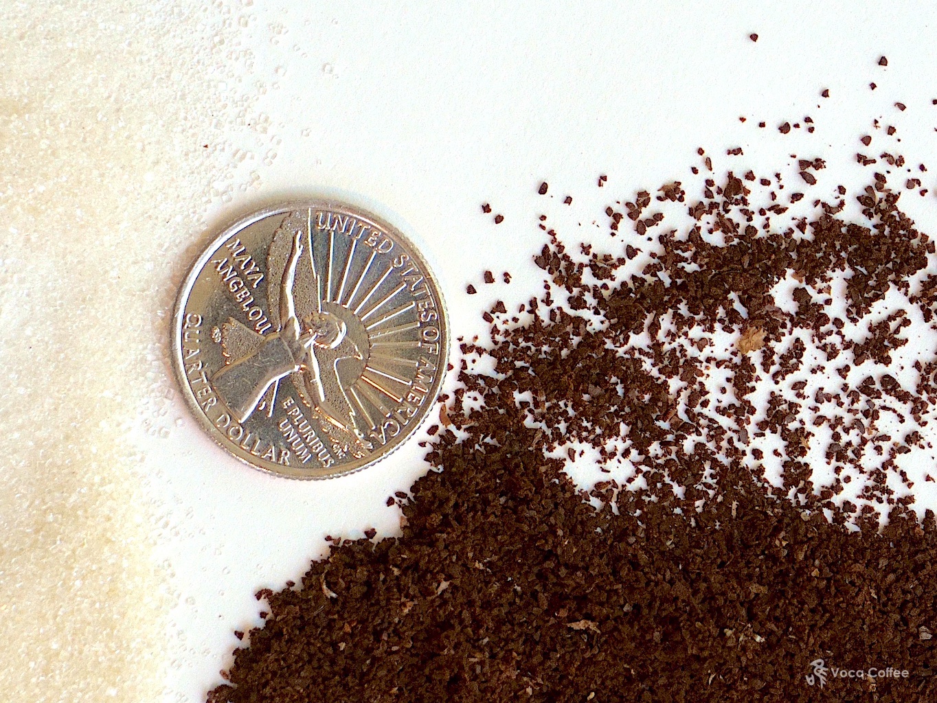 三段火山沖用的咖啡粉的粗細度跟一般的 Hario V60 手沖是一樣的。大概跟 Costco 賣的 Organic Raw Cane Sugar的顆粒度大小差不多。