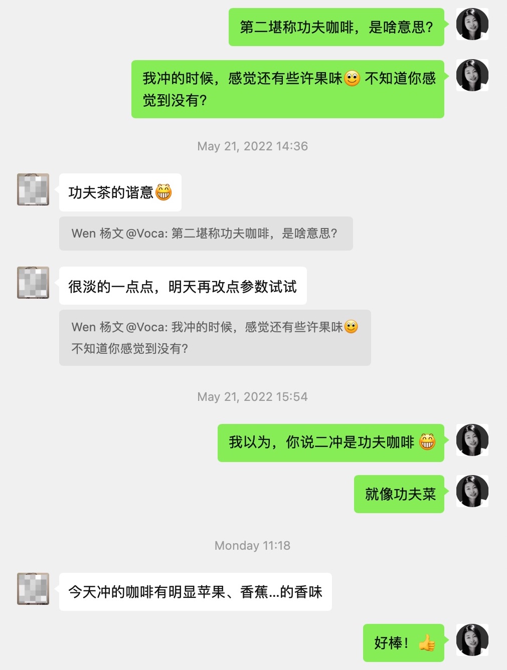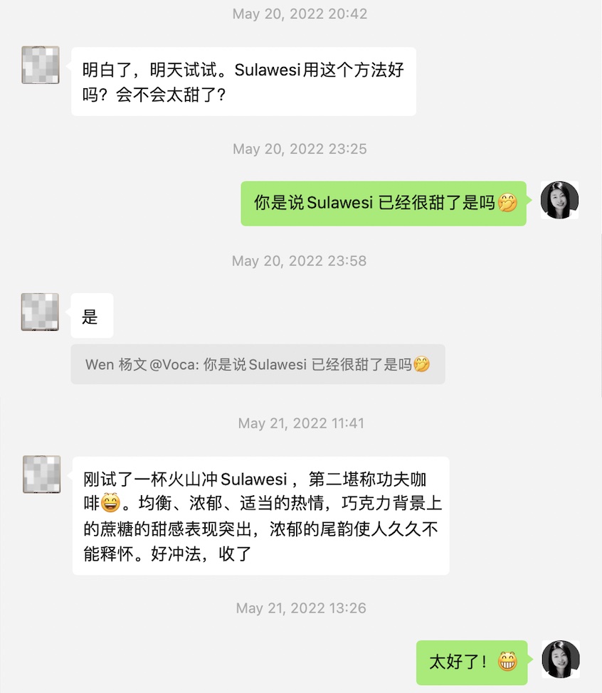 隨著新季 Sulawesi 有機日曬豆,我試驗了更多的沖泡方法。最後發現三段火山沖手法最為出色。如何出色,請看以下一段微信對話: